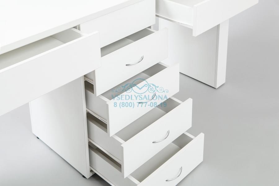 Оснащен тумбой с четырьмя выдвигающимися ящиками и двумя индивидуальными ящиками для каждого мастера маникюра. Конструкция стола сочетает плиты Egger (Австрия) толщиной 25 мм и 16 мм, обеспечивающие жесткость конструкции.