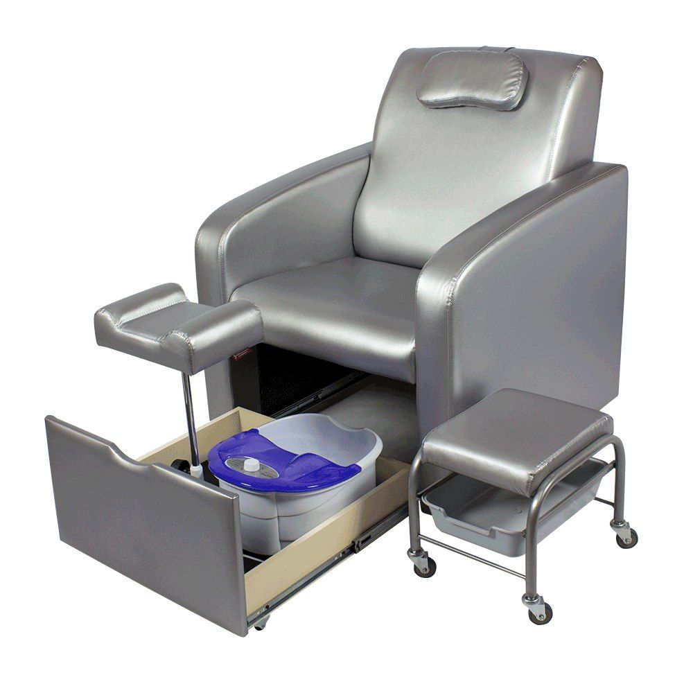 Кресло-трасформер исполнено в классическом стиле, что подойдет для любого салона. Каркас сделан из крепкого дерева. Обивка мягкой части выполнена из плотного поролона, обшитого серебристой эко кожей. Имеется выдвижная нижняя часть, в которую можно вставить педикюрную ванночку из прочного пластика. В комплекте с креслом идет опора для ног, изготовлена из того же материала, что и само кресло, однако обтянуто не серебристой, а черной эко кожей. Помимо опоры в комплект входит стул для мастера. Данный вид кресел подходит не только для салонного, но и для домашнего использования.