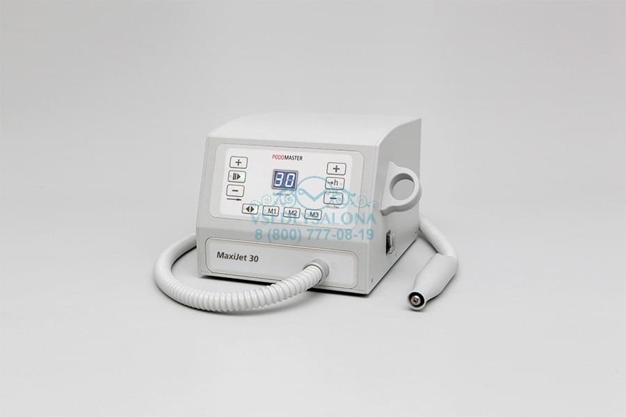 Педикюрный аппарат Podomaster MaxiJet 30 является современной моделью косметологического оборудования, предназначенного для использования в профессиональных косметологических центрах и салонах красоты. Встроенный пылесос позволяет собирать пыль, образовавшуюся во время процедуры, в специальный мешок. Устройство оснащено ультралегким наконечником, цифровым дисплеем, счетчиком часов работы и выключателем на ручке с силиконовым колпачком, защищающим от пыли, Мотор вращается со скоростью 30 000 оборотов в минуту, но с помощью специальной, педали, подключаемой к устройству, мощность можно регулировать самостоятельно.