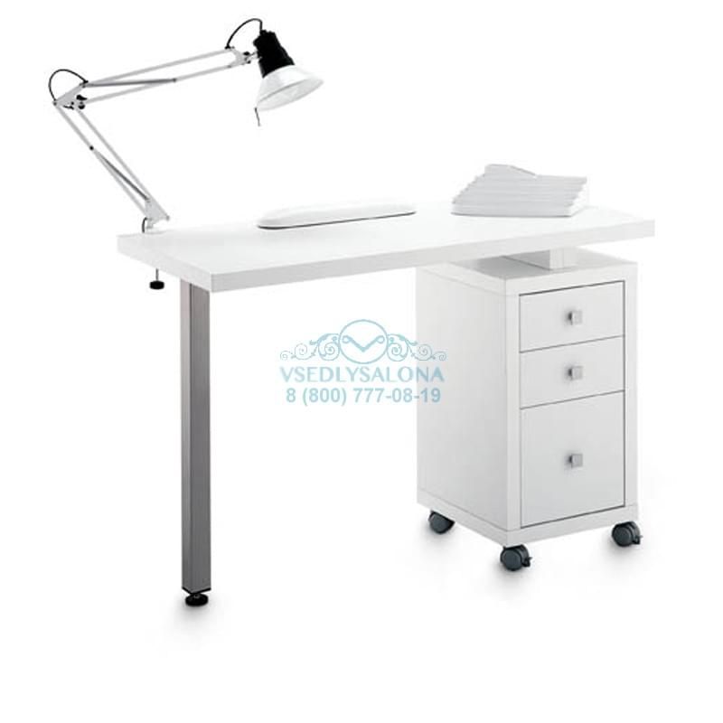 Маникюрный стол с одной тумбой, столешница и тумба ламинированные, тумба с тремя выдвижными ящиками, на колесах.