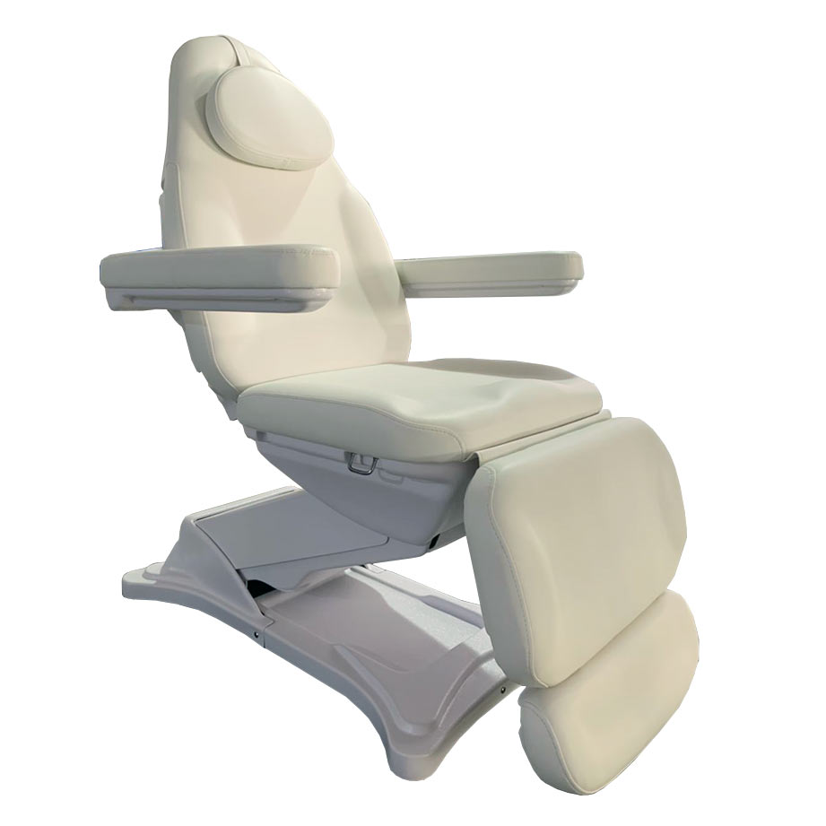 Оснащено тремя электромоторами для контроля высоты, угла наклона спинки и ножной части, подвижные подлокотники, подголовник с отверстием для лица. Высококачественная и легкоочищаемая обивка из экокожи. Элегантный, изящный, утонченный дизайн