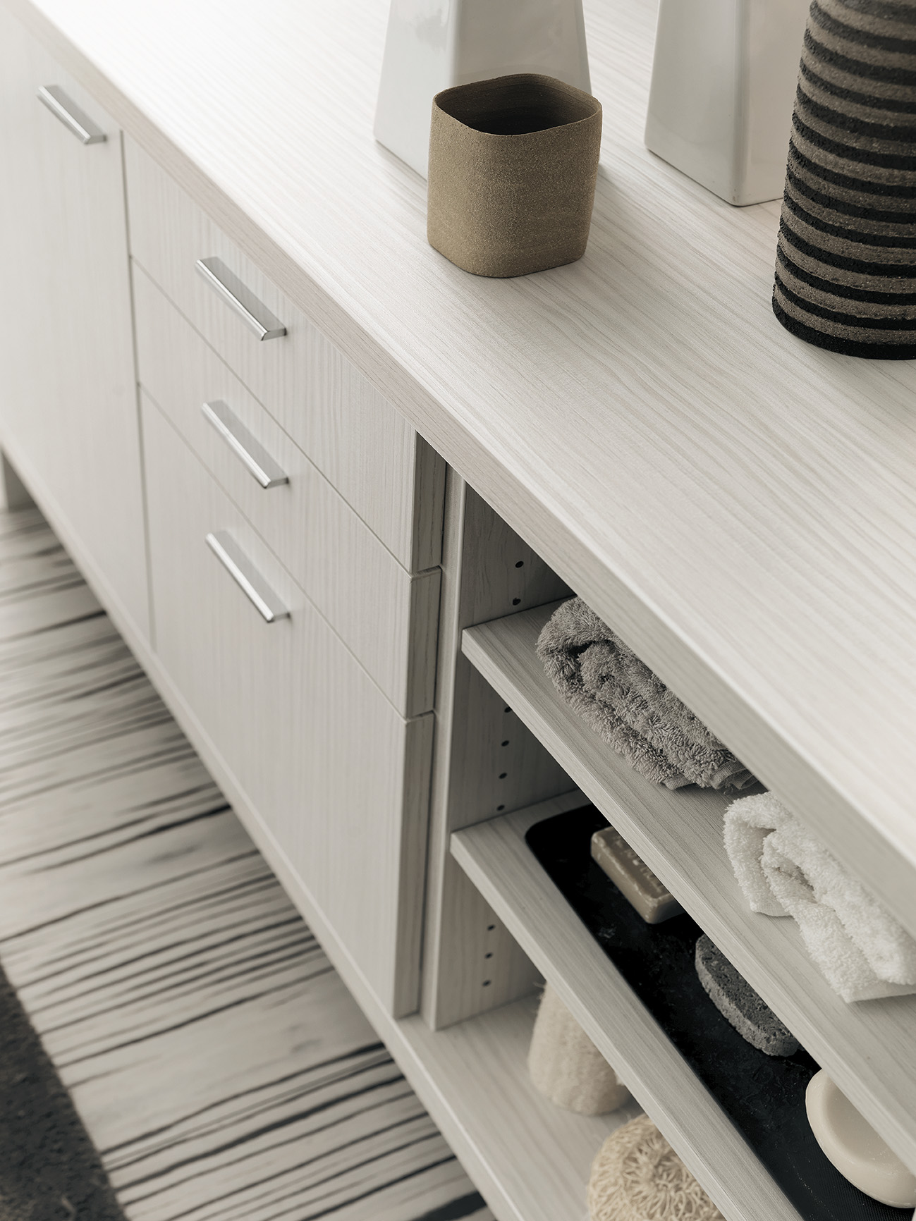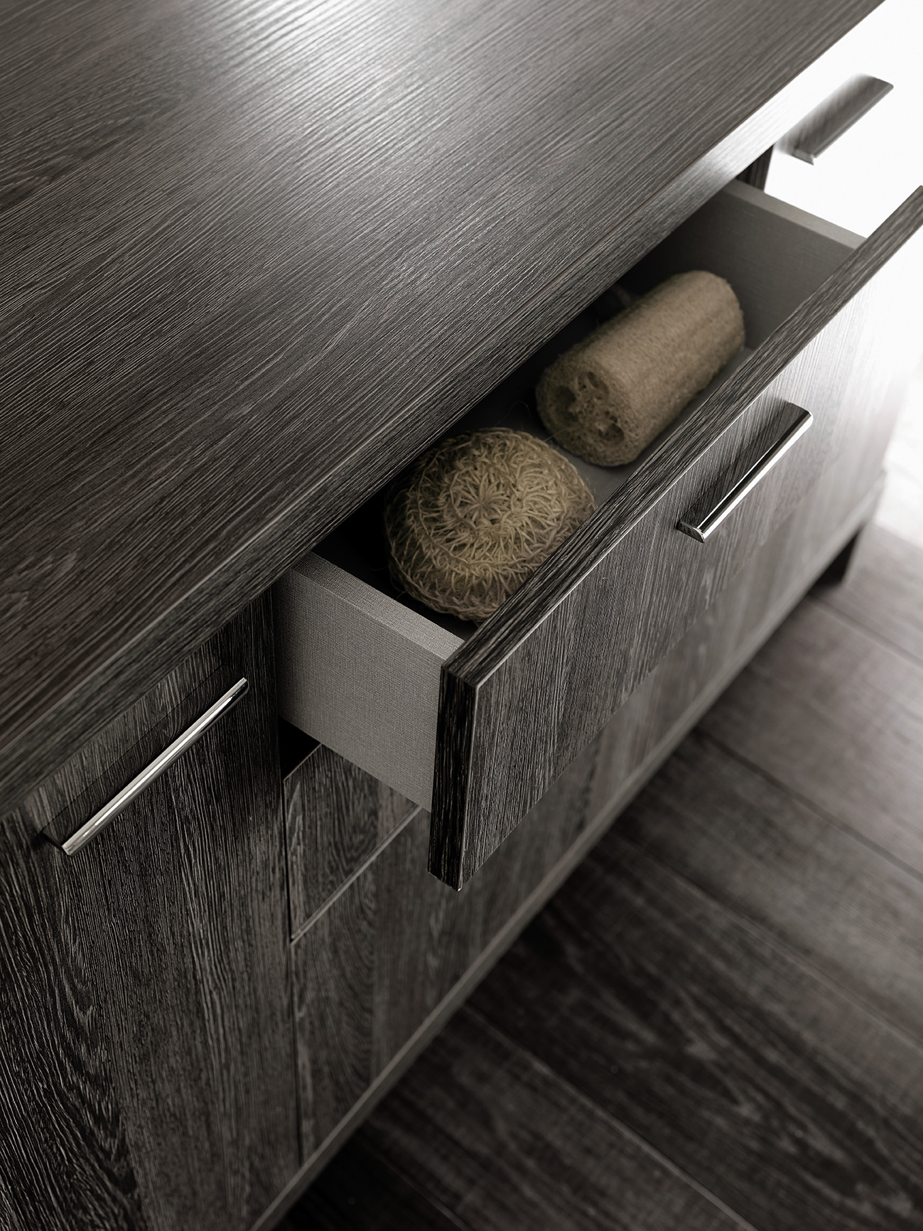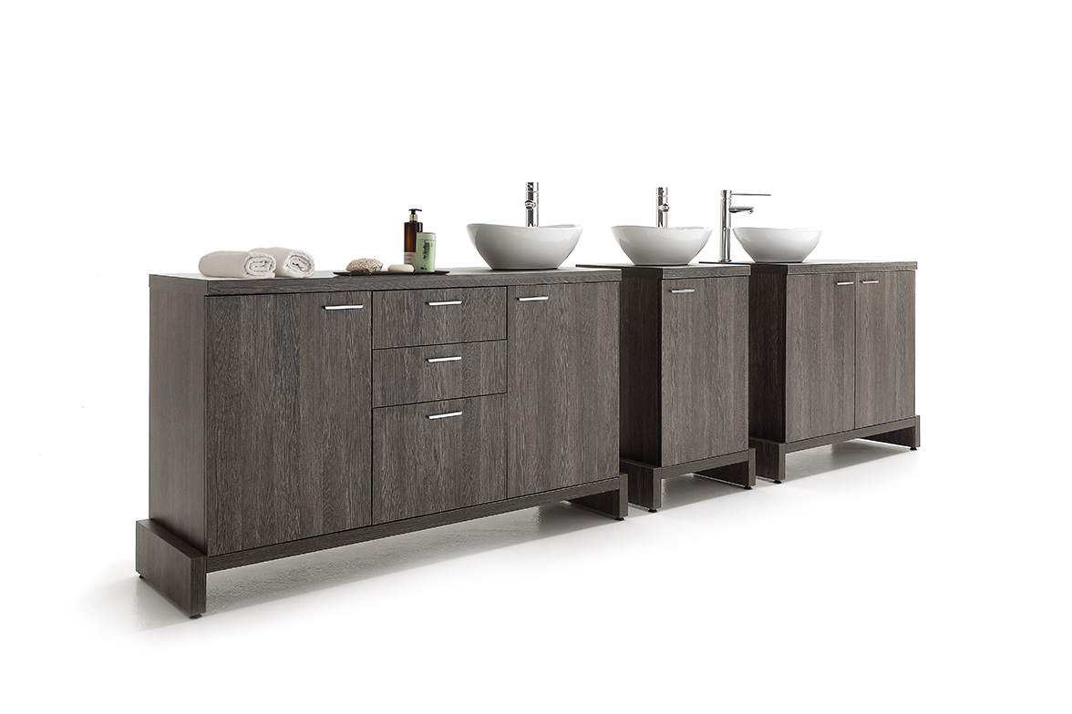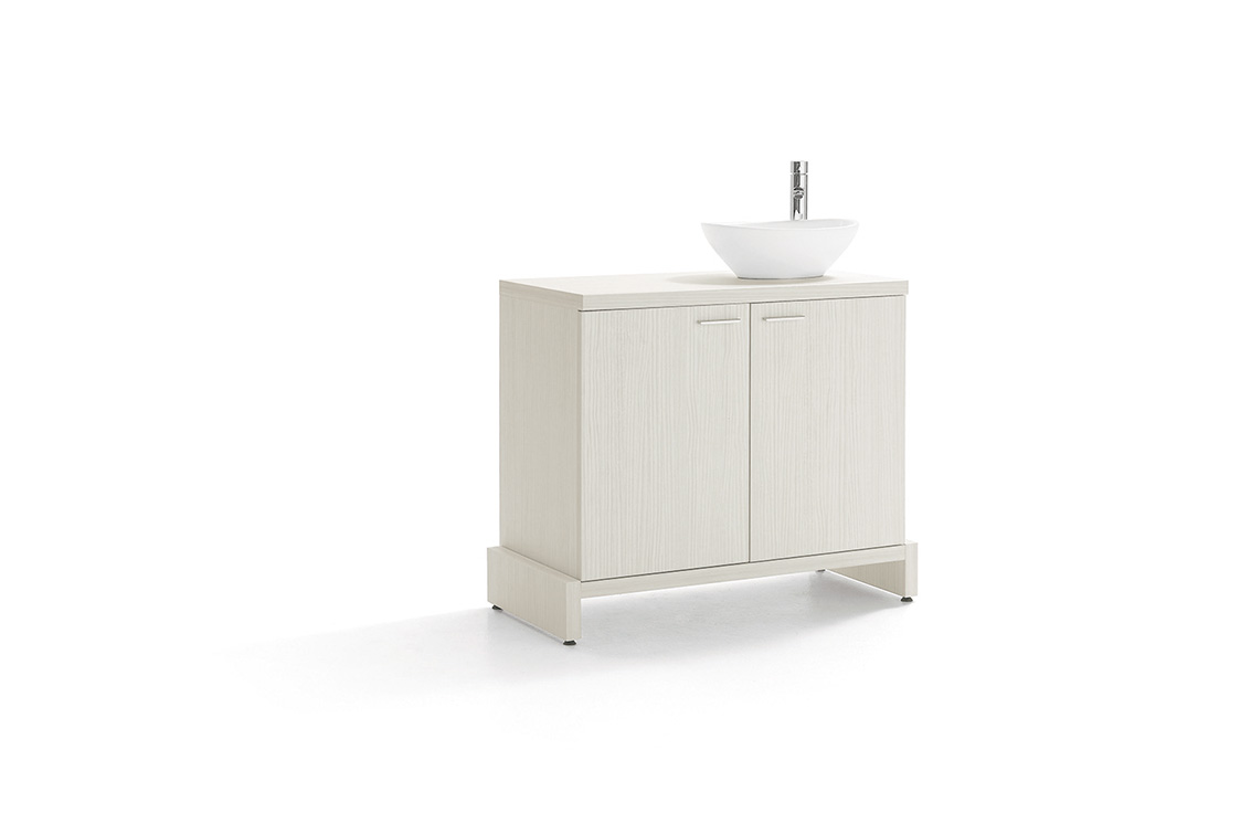 Мебель комплектуется одной дверцей с автоматическим доводчиком. Деревянные ножки могут быть заменены на ножки из хромированной стали. Также мебель может дополнительно комплектоваться раковиной с хромированным смесителем. Столешница имеет большую площадь, что позволяет размещать на ней различные средства и полотенца.