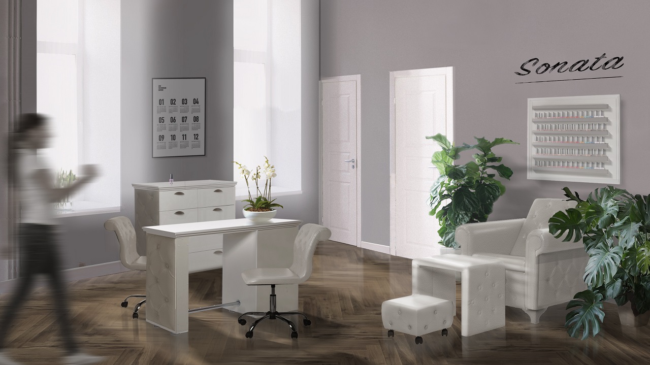 Администраторская стойка «Соната» сразу же привлекает к себе внимание. Каретная стяжка с мягкой текстурой выглядит современно и стильно, придает вашему заведению статуса и изысканности. Дополнительный эффект достигается за счет использования элегантных резных ножек, выступающих в роли некоего акцентного элемента. Со стороны администратора практически всю площадь занимают полочки и дверки, где можно разместить все для работы и личные вещи, если надобность в этом есть. Цвета отделки можно выбрать практически любые, что позволяет реализовать самые креативные идеи и придать вашей парикмахерской или салону красоты больше индивидуальности.