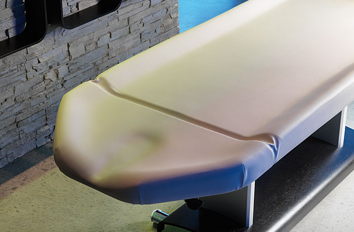 Особенностью является бесшовный матрас эргономичной формы, который позволяет клиенту максимально расслабиться во время процедуры. Регулировка угла наклона подголовника выполняется механически. Матрас располагается на основании, выполненном из хромированной стали.