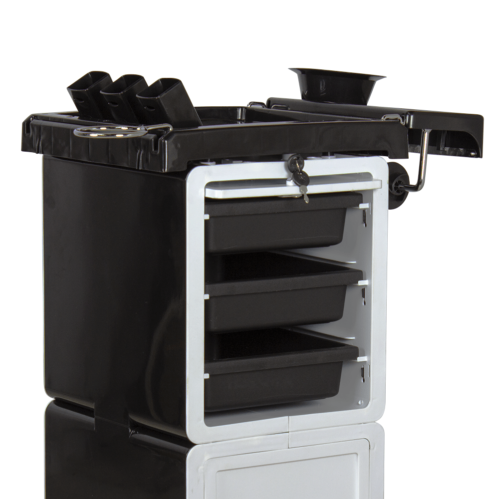 Тележка парикмахерская "Т-18" выполнена из ударопрочного пластика, а отдельные элементы из хромированного металла. Каркас состоит из двух отдельных блоков, закрывающихся на ключ. В каждом блоке расположено по три выдвижных ящички, в которых мастер сможет хранить расходные материалы, инструменты и прочие принадлежности. Вместительность парикмахерской тележки дополняет функциональная верхняя крышка со съемными элементами для размещения брашингов и боковой полочкой. Также тележка для парикмахерской комплектуется металлическим держателем для фена и держателем для бумажных полотенец. Внизу с обеих сторон установлены держатели демонстрационных материалов, например, каталогов с образцами палитры краски для волос.