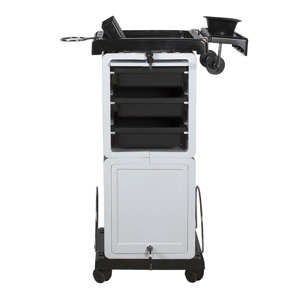 Комплектация: каркас, шесть ящиков, верхняя крышка со съемными блоками для рабочих принадлежностей, боковая полочка, держатель для фена, держатель для полотенец, основание на колесах, держатель для фольги с удобным отрезным краем, два держателя для буклетов с образцами красок для волос.