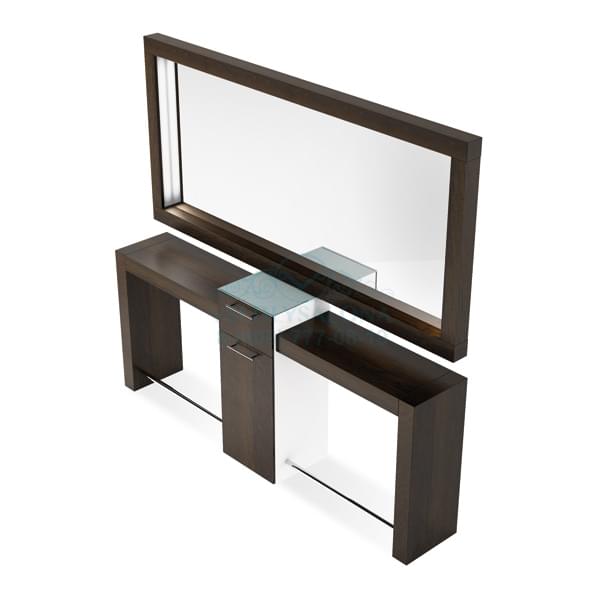 Не перегружен деталями, имеет правильные и симметричные формы. Туалет исполнен сдержанного достоинства, вкуса и респектабельности. Это зеркало придаст вашему салону роскошный и оригинальный вид и объединит пространство сразу двух работающих мастеров. Размеры, см : 210(Ш) x 195(В) x 40(Г)