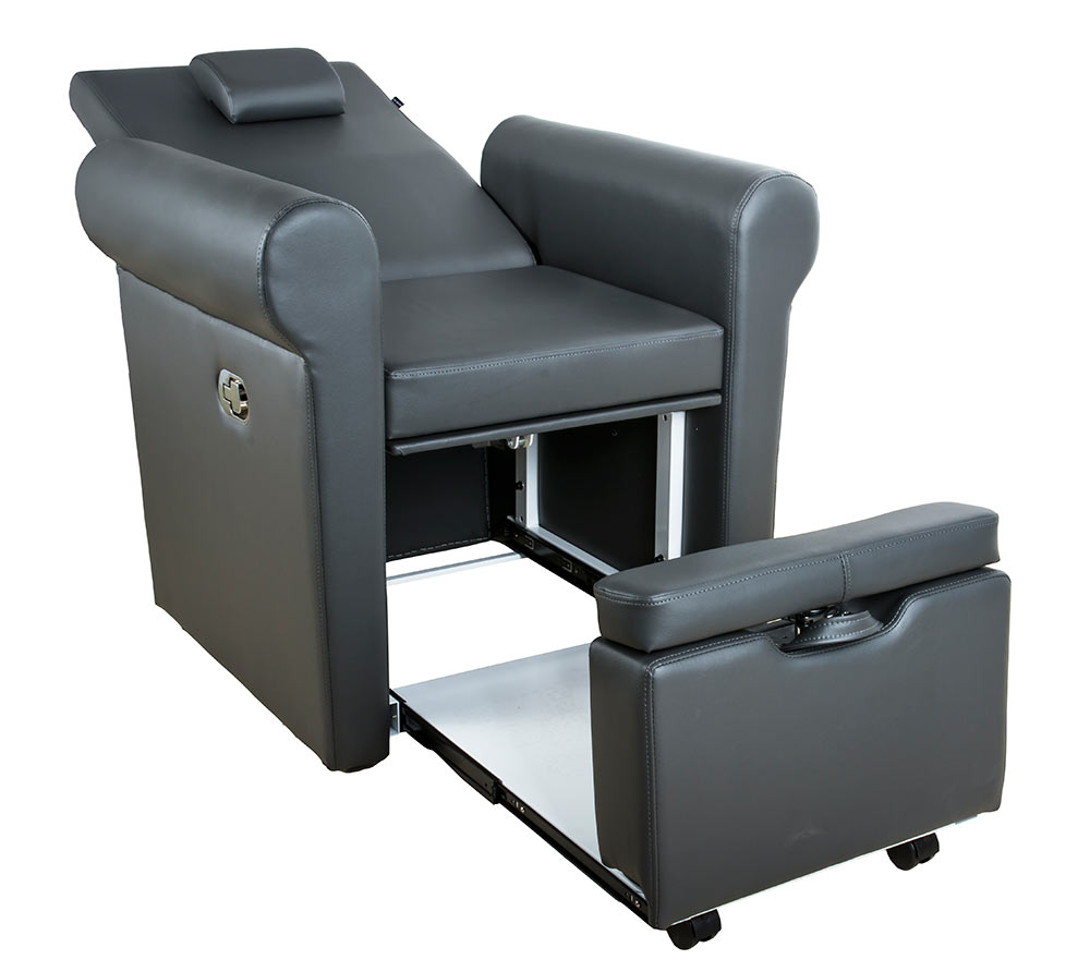 Подойдет также для работы с бровями и ресницами. Данная модель снабжена выдвижной полкой под ванночку и регулируемой по высоте подставкой для ног. Есть возможность изменить угол наклона спинки от 0 до 74 градусов.