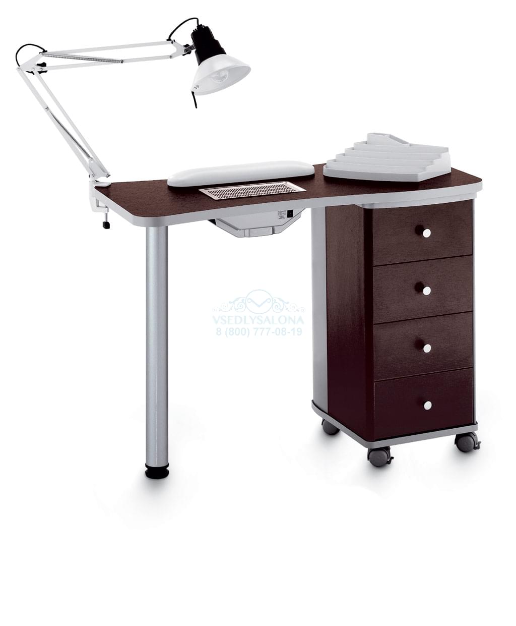 Маникюрный стол с вытяжкой, одной тумбой и ламинированной столешницей цвета венге. Тумба выполнена из ДСП, оснащена четырьмя выдвижными ящиками и колесами. В комплекте: лампа, подушка для маникюра, подставка для лаков. Размер: 98х48x74