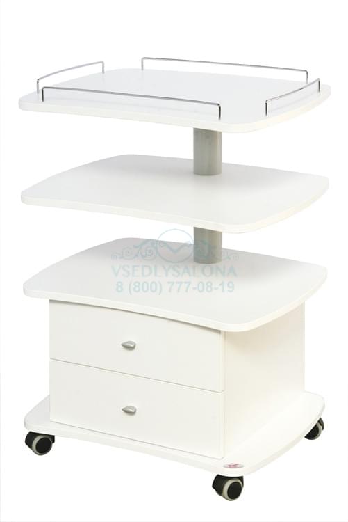 Столик передвижной из ДСП, три полки и два выдвижных ящика. Цвет белый.