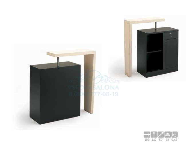Стойка администратора выполнена из ламинированного пластика цвета венге. Столешница изготовлена из светлого дерева. Комплектуется двумя открытыми полками, выдвижным ящиком с замком и полкой с дверцей.