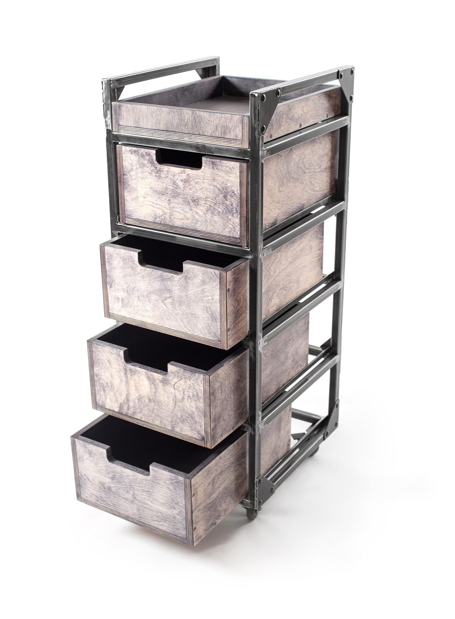 Барбершоп тележка "Ironic Rack 2" оснащена тремя глубокими ящиками, два из которых изготовлены из высококачественной стали. Прорезиненные колесные опоры со стопорами обеспечивают низкий уровень шума при передвижении.