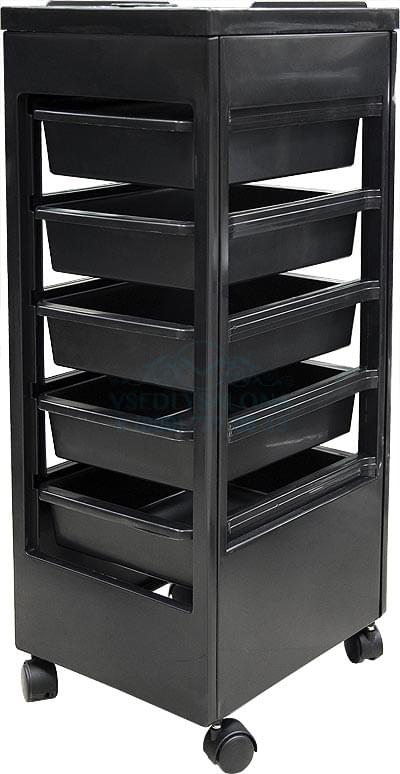 Тележка парикмахерская черного цвета на колесах, с пятью выдвижными ящиками. Размер 38х32х89