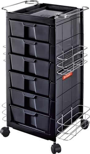 Тележка парикмахерская для инструментов закрытого типа на колесиках. Выполнена из прочного пластика, имеет 6 выдвижных ящиков, фенодержатель и боковые полочки из металла. Размер (ДхШхВ): 37х37х85