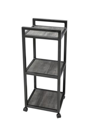 Тележка оснащена тремя полками из ЛДСП и колесиками со стопором.