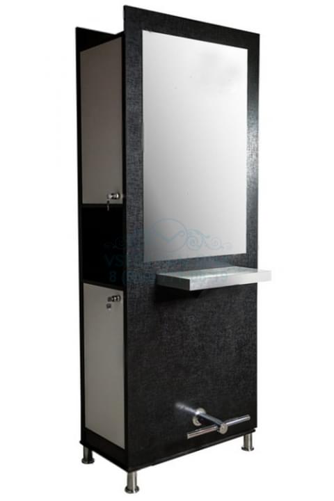Зеркало двустороннее, каркас ламинированное ДСП. Совмещает в себе две фукции: шкаф с полками и рабочее место для парикмахера. Шкафчики с замками. Столешница декоративный пластик, ножки и подставка под ноги хром. Зеркало под заказ. Мы с удовольствием изготовим зеркала под дизайн Вашего салона из представленных ниже расцветок ДСП. Возможен односторонний или двусторонний вариант рабочего туалета