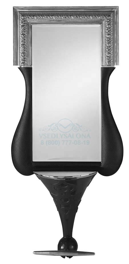 Зеркало парикмахерское оригинальной формы, декорированная верхушка рамы золотого цвета с черным продолжением, металлическая столешница округлой формы, металлическая подставка под ноги. Крепление к стене. Размер (ДхШхВ): 84х36х200