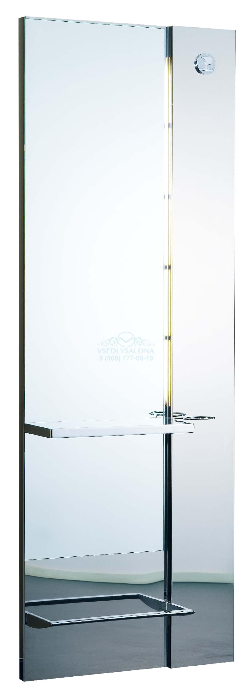 Зеркало парикмахерское прямоугольной формы в алюминиевой раме или в раме из нержавеющей стали с подсветкой, плоская хромированная столешница с фенодержателем, металлическая подставка под ноги. Крепление к стене. Размер (ДхШхВ): 75х25х210